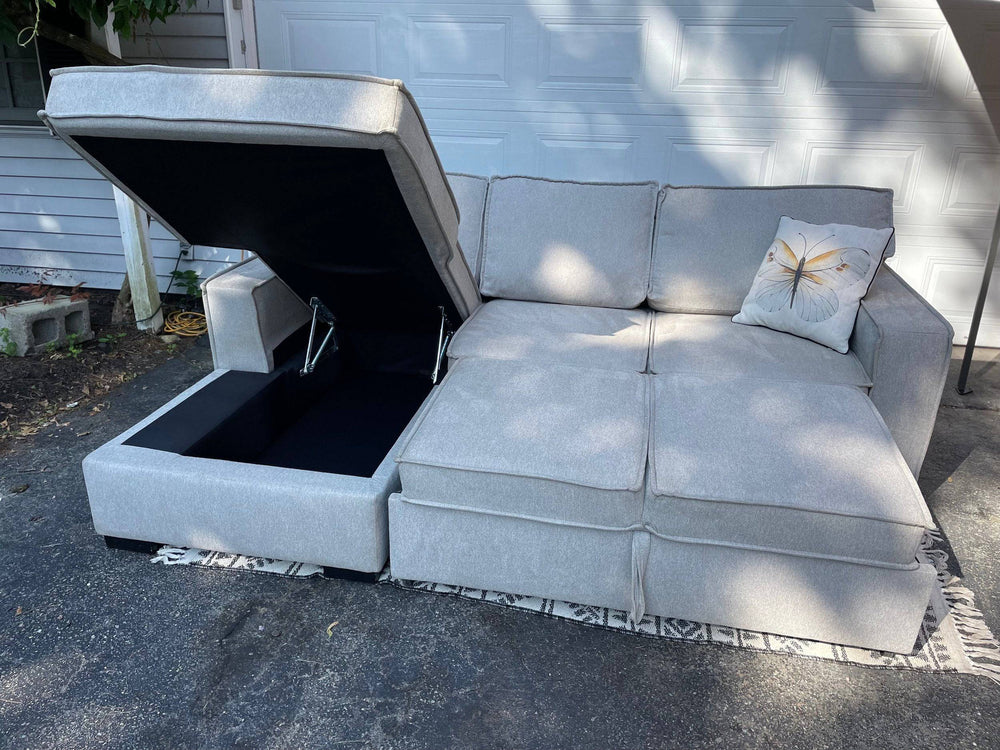 🔥 Gray 2 piece sectional with left-facing chaise, storage, and pop-up sleeper. About 2 years old, it’s in excellent condition with No Rips, No Stains, No Damage, and No smoke. It is pet friendly, but has been professionally cleaned to freshen it up for a new home.