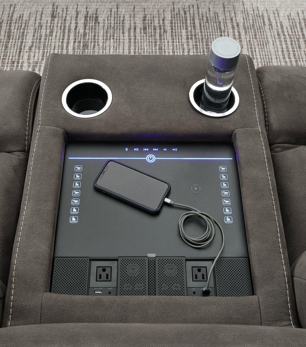 Stylish in design and function, this power reclining sectional with console creates a comfortable place to gather with family and friends. The sectional, upholstered in heavyweight faux leather with quilting and jumbo stitching, invites you to sink into plush opulence at an affordable price. The zero-wall power reclining mechanism features infinite positions for comfort. Conveniently plug in your devices to the USB charging station. Appealing to those with an eye for sumptuous design and high-tech features, this gunmetal gray sectional will always be a win.