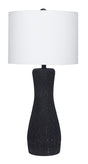 Stunning in its modern elegance, this table lamp knows how to make a statement. A sleek black textured finish accentuates the metal for an upscale look. What a winner by a sofa or bed.