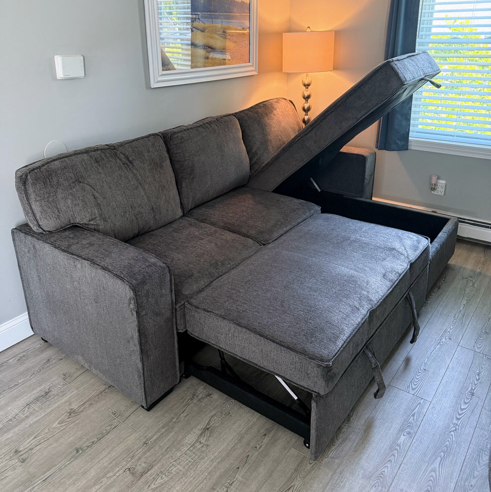 Sofa w/Reversible Chaise (moves to right or left side). Dark gray chenille fabric. Storage chaise, popup trundel bed, flip down center console with usb and power port.