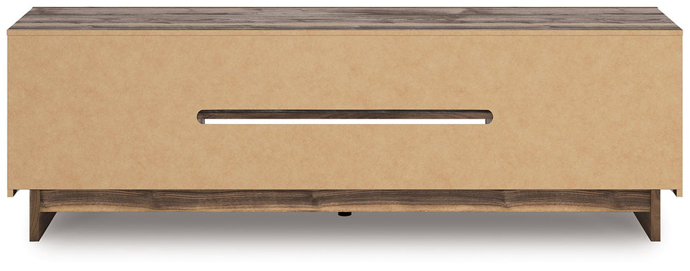 Nostalgic style, retooled for today’s trends. This TV stand with electric fireplace puts an elevated twist on mod aesthetics. Its warm brown tones reflect the mid-century vibes you love, while the angular base incorporates contemporary motifs. Integrated drawer handles round out the look in sleek style. For added ambiance, the electric fireplace brings a cozy-cool vibe to your living room. With the touch of a button, activate the LED-lit flame and adjust the temperature or the flame brightness. The flame effect includes multiple color options and a realistic-looking faux birch log set.