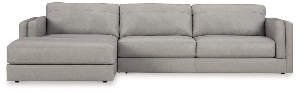 Keen on crisp, contemporary design? Adore the pleasure of leather? Look no further. This sectional with chaise satisfies on every level. Richly textured and decadently supple, the plush cushions are wrapped with expertly matched leather and faux leather upholstery in an on-trend neutral tone. Sleek double-padded arms and a low, clean-lined profile complete this spacious sectional's simply chic appeal.