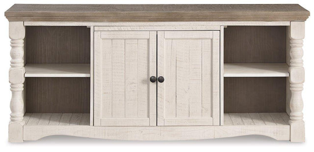 Set your sights on modern farmhouse style with this XL TV stand. Distressed two-tone treatment blends a weathered gray with vintage white for an utterly charming effect. Turned posts lend a hearty, substantial look that feels right at home, while plenty of open shelving makes the aesthetic anything but heavy.