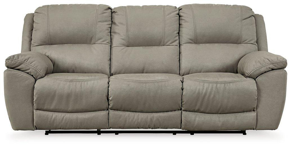 Kick back, relax, and enjoy some sports on TV with this reclining sofa. You will love its double stuffed pillow top arms and soft-as-suede faux leather upholstery. The family-friendly dark gray color and creative stitching add panache. Recline in comfort even if floor space is limited, thanks to the space-efficient zero wall design. This bustle back sofa will always be a win.