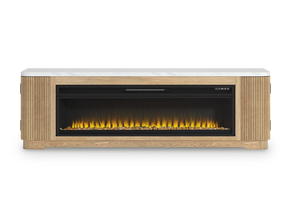 Elegance meets earthy charm in this TV stand with electric fireplace. Crafting a contemporary living room? The faux marble top expertly pairs with the reeded base for a trend-right take on day-to-day function. Open shelving and subtly integrated storage cabinets make it easy to store and display media accessories in style. For your added viewing pleasure, the wide fireplace insert gives you the cozy feel of a fireplace without the added hassle. With the touch of a button, adjust the temperature and the color-changing flames, and set the timer for long-lasting enjoyment. It comes with faux glass crystals and natural stones, so you can customize the look of the flame bed.