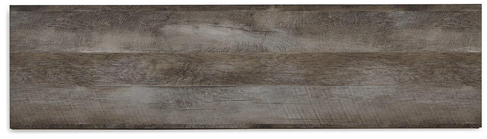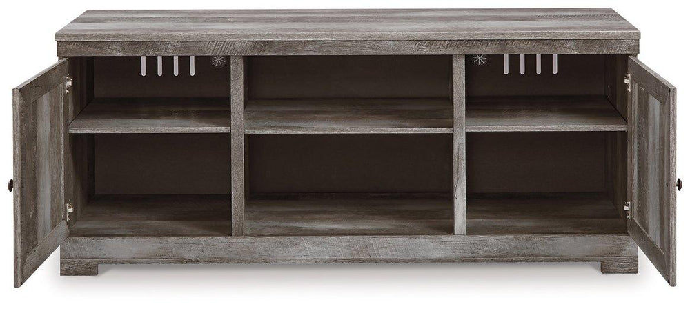This entertainment center is sure to win your heart with its daring designer take on modern rustic. Its crisp, clean and minimalist-chic profile is enriched with a striking replicated oak grain with thick plank styling and a weathered gray finish for that much more authentic character. Crossbuck detailing adds a brilliant barn door inspired touch, while LED overhead lighting and glass shelving invite you to artfully put home accents on display. What really turns up the heat: an electric infrared fireplace insert with faux firebrick surround that operates with or without infrared heat and includes a multi flame feature, 7-level temperature setting, five brightness levels and LED glowing embers effect.