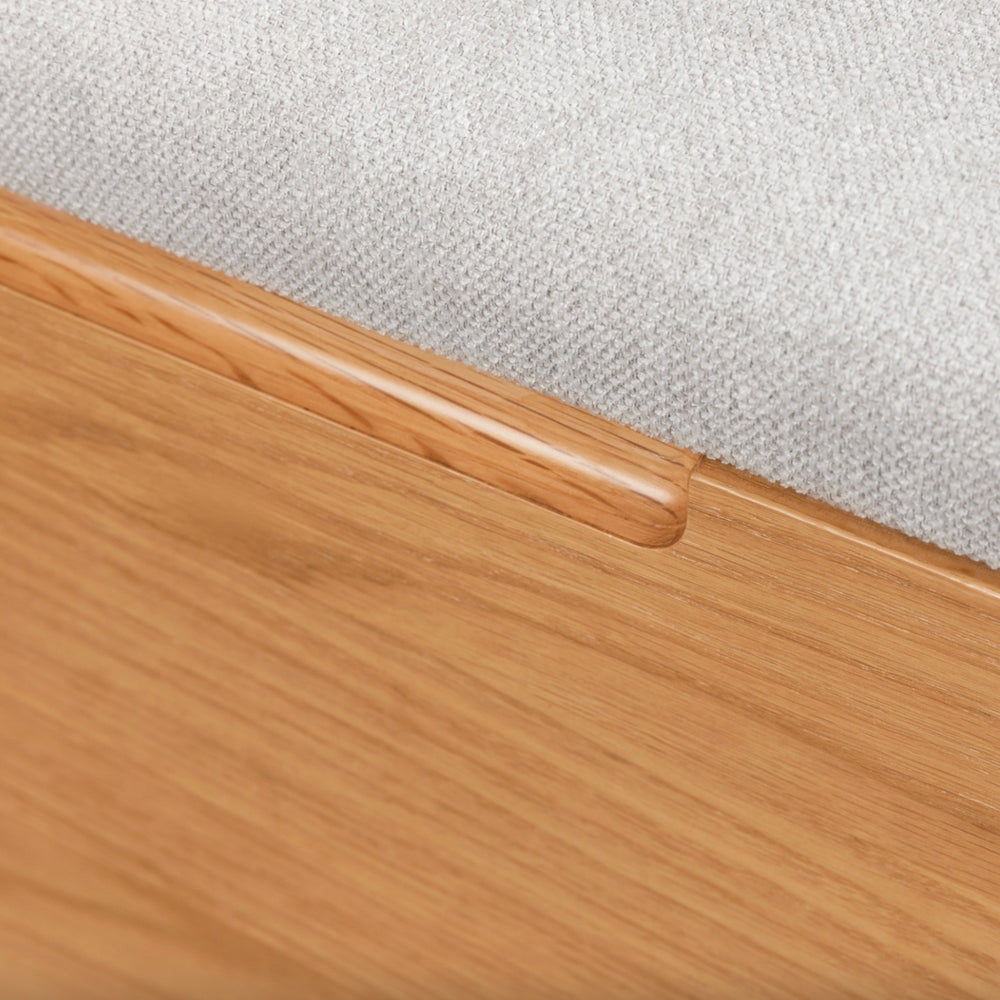 This is an MCM-style storage bench with Oak wood and Everest Gray upholstery. We have TWO of these at time of listing.