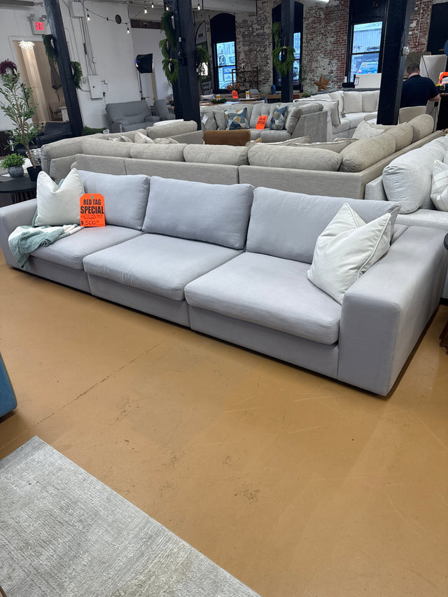 This is an Article Beta 137.5" Modular Sofa in Welsh Gray fabric. this particular couch is in good condition. It was used in a customer‘s home for a little while, and there is a little slight sun fading on one arm and one tiny little defect on the other arm, and it’s got some evidence of where but it’s in good condition.  Priced accordingly.