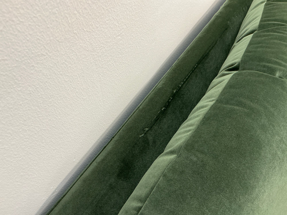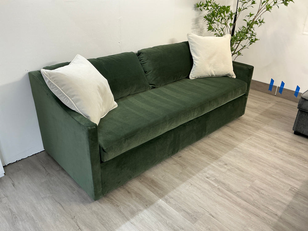 This is a Landry Sofa Bed with Fir Green velvet upholstery. This bed has a few marks on the velvet along the back edge from getting in and out of somebody’s apartment and the bottom corner in the rear is torn a little bit but other than that, it works just fine. It’s great condition. It’s priced accordingly at 50% off