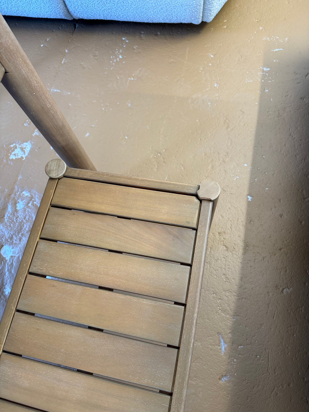 This is a Rosa outdoor dining set. Includes dining table + two benches. Some minor scuffs in top edge and 3 of the bench legs have minor chips.