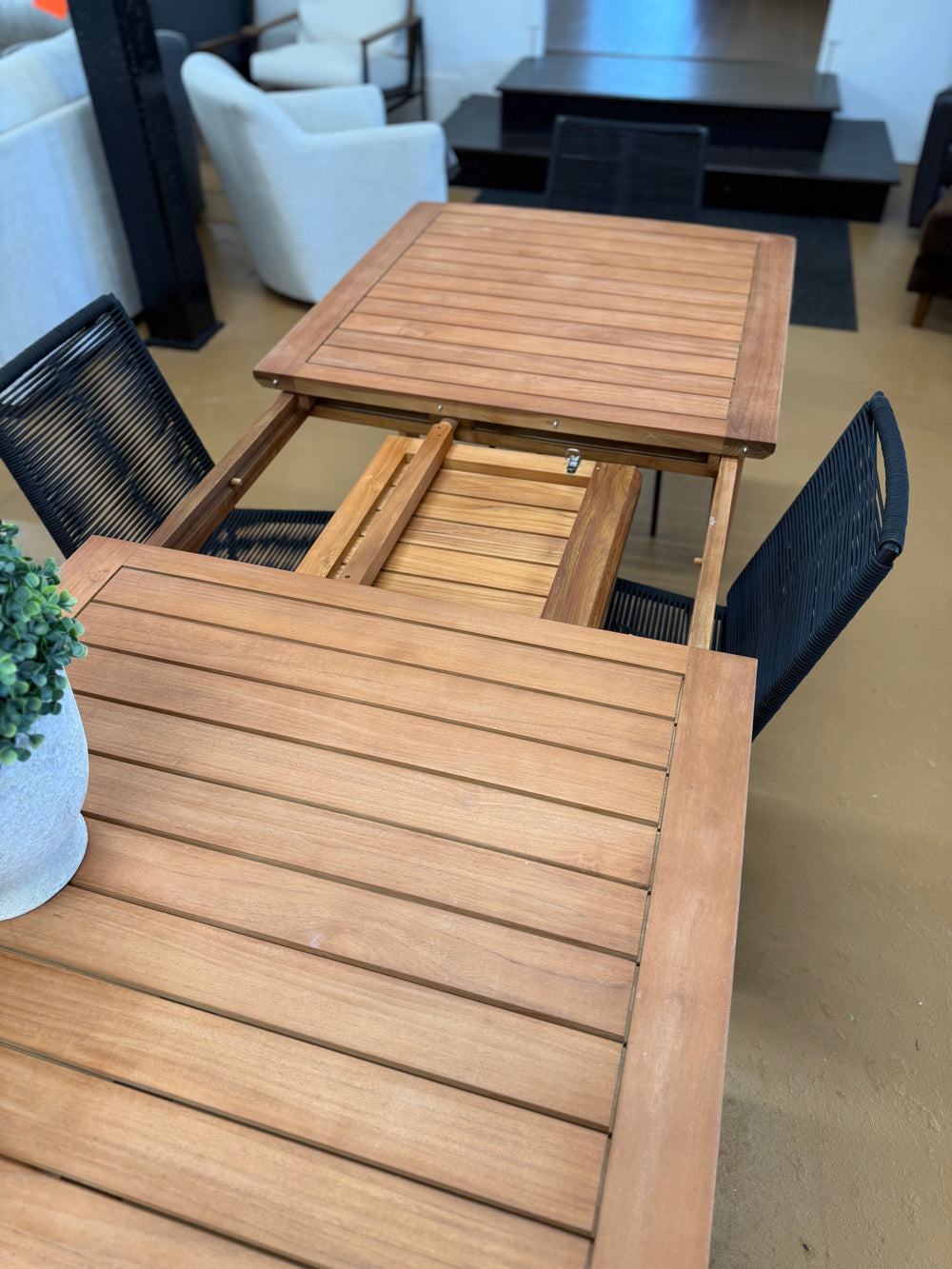 This is an Article Marol 76.5" - 95.5" Outdoor Extendable Dining Table in Bronze Teak color. It's in perfect and brand new condition with no defects.