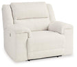 This oversized power recliner seamlessly complements your contemporary cozy space. Bold block arms accentuated with form-fitting padding lend a high-style silhouette. An ample seating area invites you to sprawl during binge watches and relaxed reading hours alike. And with reclining at the press of a button, this piece proves chic design and superb comfort go hand in hand.