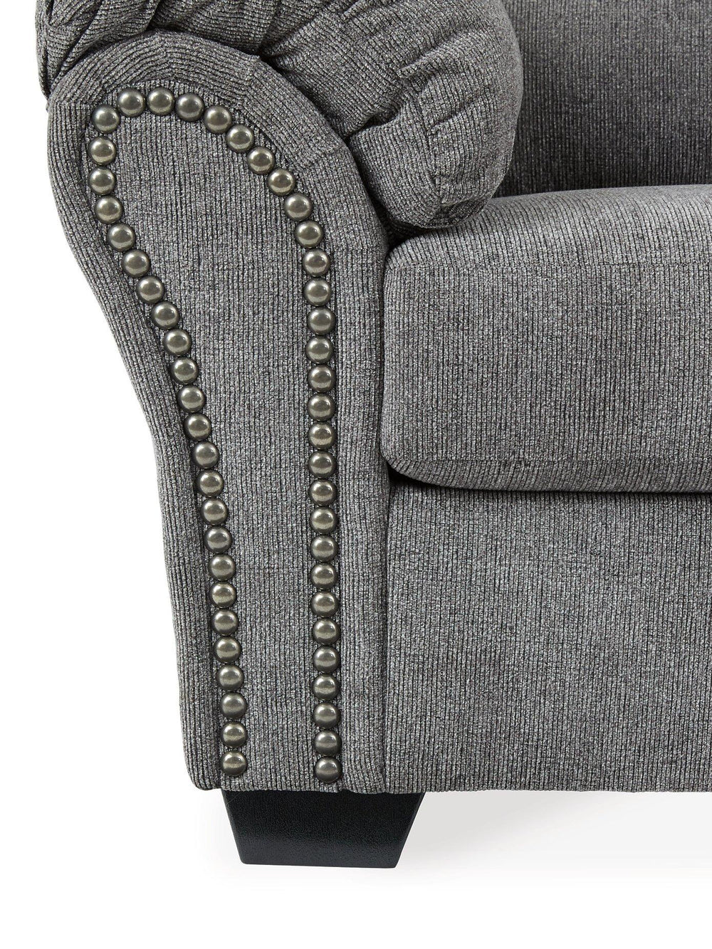 Why sacrifice comfort for style (or style for comfort) when you can have the best of both in this loveseat in pewter gray. Elements include a chic divided-back design and pillow top wrapped armrests that make nodding off all too easy. Calling attention to the elegantly flared armrests—black nickel-tone nailhead trim for a punch of cool character.