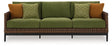 This outdoor sofa recalls the aesthetics of nature to bring an inviting, high-style feel to your patio or lanai. Its Nuvella+™ performance fabric is made with enhanced UV resistance, so the chic green hue stays brighter for longer. Worried about the weather? Don't sweat it—the durable resin wicker withstands the elements from season to season.