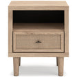 Clean-lined and contemporary—but far from stark—this nightstand is a fresh style awakening. Pairing a light finish with replicated oak grain and textured beige details that replicate the look of cane, its mixed materials bring a naturally versatile vibe to your bedroom. Sleek, simple hardware plays perfectly with the modern aesthetic. A smooth-gliding drawer and USB charging keep your clutter contained and your gadgets powered. Warm LED lighting not only illuminates your restful retreat but also adds a touch of unmatched style.
