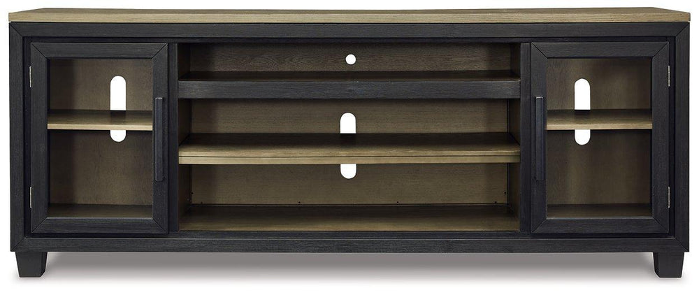 This TV stand with fireplace is rustic, casual contemporary style simply done right. Its two-tone color scheme features a rich brushed black finish accented with a dusty grayish brown wood tone. With two glass-front cabinets (each with an adjustable shelf), an open cubby and a removable center shelf, it offers plenty of storage to house all of your electronic needs. For added viewing pleasure, the electric infrared fireplace insert brings the cozy feeling of a fireplace without the work or worry. It's just the thing for a perfect night in.