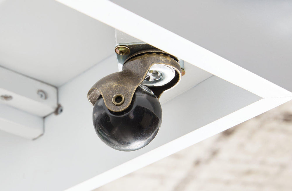 - Exposed feet with faux wood finish