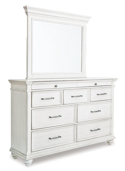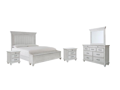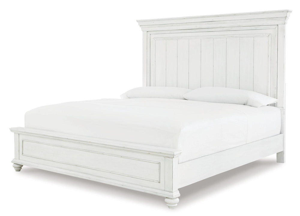 Give your retreat vintage charm with the Kanwyn bedroom set in a beautifully distressed whitewash finish. You'll love the headboard's grand style featuring an inset button-tufted upholstery cushion. Generously scaled moulding, framed drawer fronts, nailhead trim and bun feet enhance the character of this bedroom set—evoking the feel of a quaint cottage escape.
