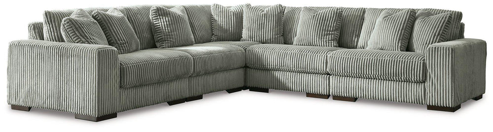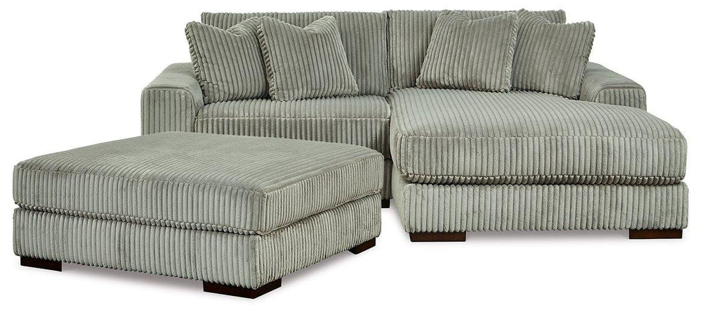 Plush and posh. Showcase your eye for on-trend texture with the statement-making cord upholstery of this sectional and ottoman package. Its stunningly soft fabric entices in a light gray hue, complementing contemporary color palettes. Sink into the cushions and plan to stay a while—this cozy living room seating set highlights your high-end approach to comfort and style.