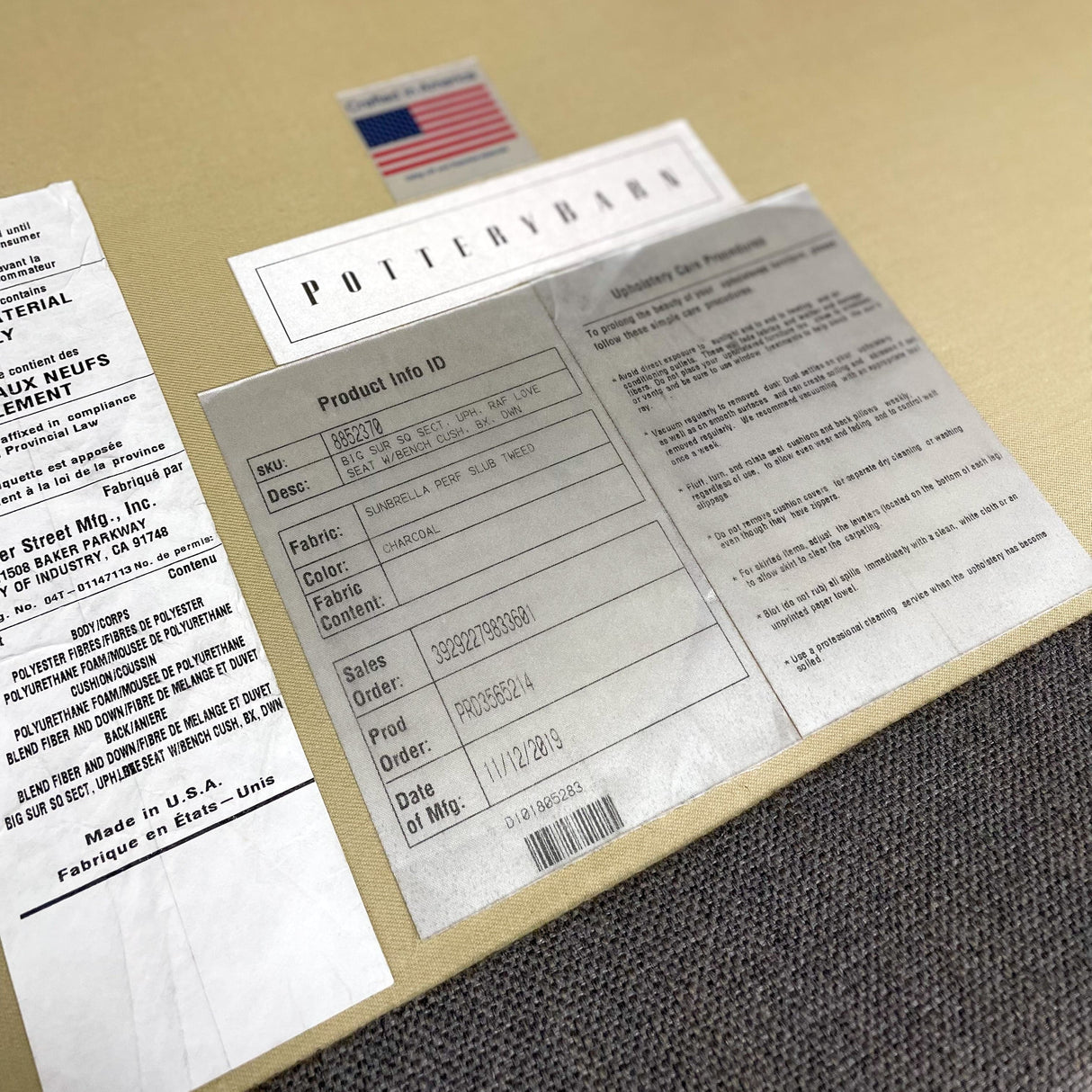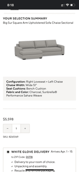 A Pottery Barn Big Sur 2 piece sectional with bench seat and huge left-facing chaise, and sunbrella performance fabric. Just a few years old, it’s in perfect like-new condition with no rips, no damage, no stains, pet-free and smoke-free. Super heavy down-filled cushions all unzip for washing. Comes apart into 2 sections for easy delivery. It has been professionally cleaned to freshen it up for a new home. This couch is very sturdy and comfy with very nice and thick fabric. Cushions are firm, yet very comfy.