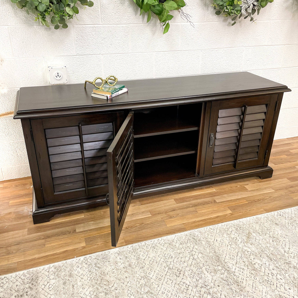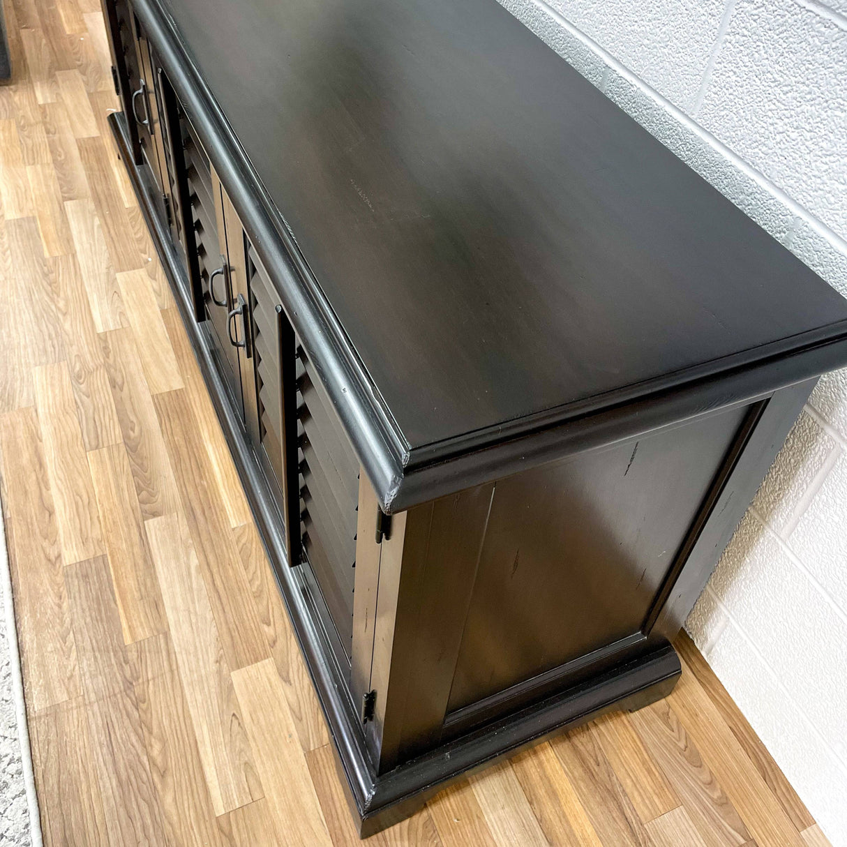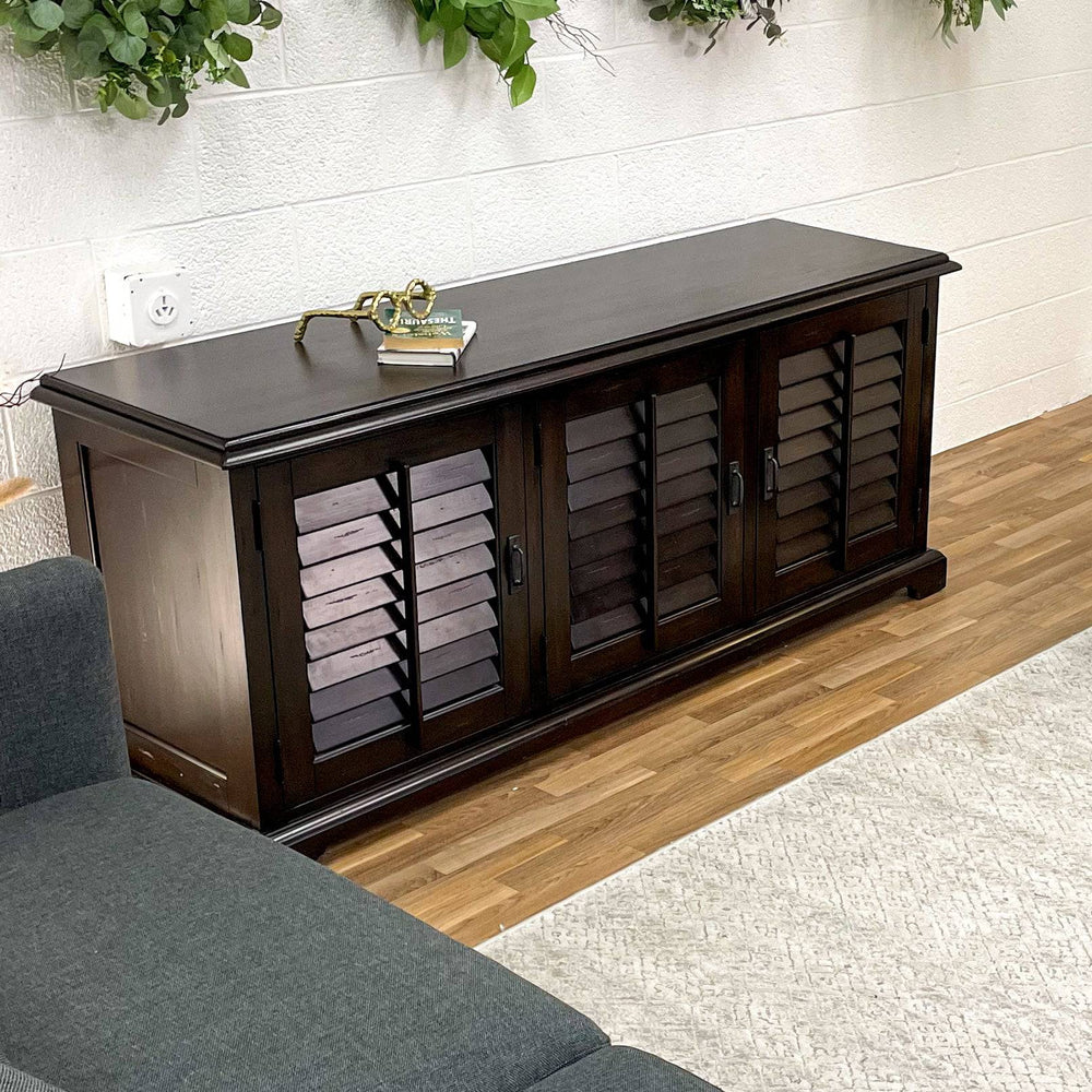Pottery Barn Holstead Media Cabinet w/3 Louvered Doors Built with with solid wood and stained in beautiful dark walnut. It’s in Like-new condition with No damage or scratches.