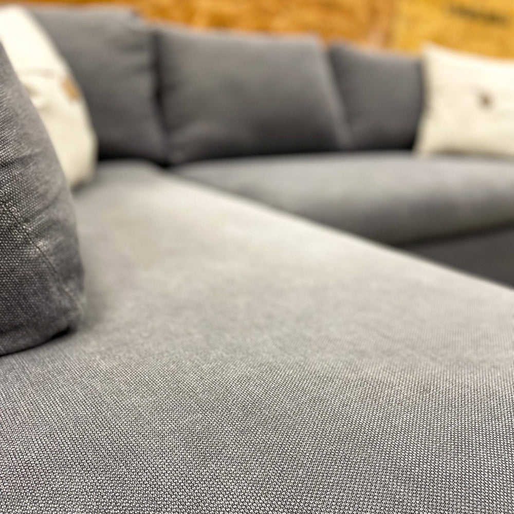 Pottery Barn 2 piece sectional with left-facing bumper chaise and gray fabric with bench cushions.
