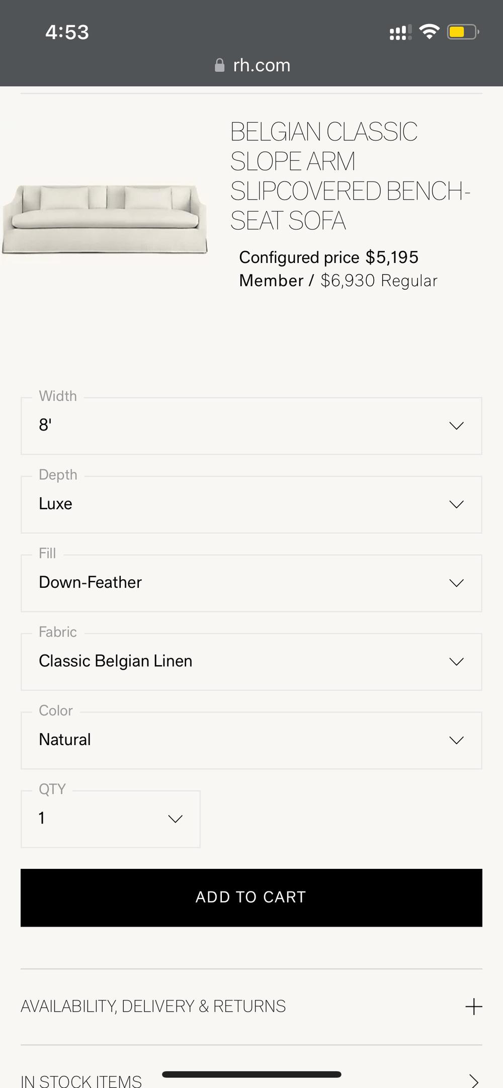 Restoration Hardware 8ft Luxe Slip Cover Bench Sofa w/Belgian Linen is backordered and will ship as soon as it is back in stock.