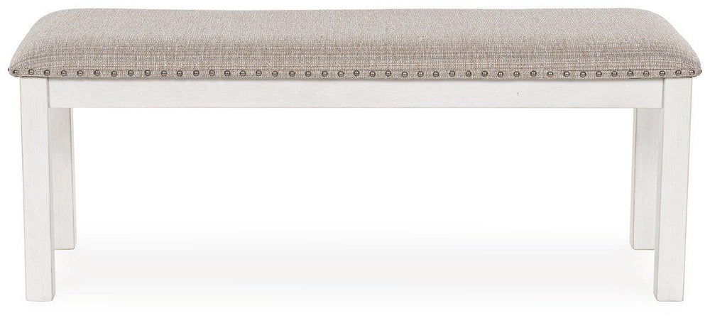 The Robbinsdale dining bench is sure to impress come mealtime. With its antiqued white finish and light gray upholstery with nailhead trim, modern farmhouse-style dining has never been so fashionable. All that's missing is you and your family.