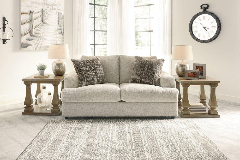 Flaunting a trendsetting silhouette, this loveseat puts the contemporary in your contemporary home. Its “three over two†profile eliminates the center seat cushion, giving you elongated plushness and deep seating. Microfiber fabric satisfies your need for a piece that feels as good as it looks. Accented with soft jacquard chenille throw pillows for a splash of geometric pattern and color contrast.