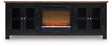 Raise the bar on modern farmhouse style with this TV stand with electric fireplace. Its sturdy silhouette and casual good looks are accentuated with a two-tone finish, which pairs a warm satin black base with a contrasting butcher block veneer top. Glass door cabinets with adjustable shelves offer plenty of storage for media and electronics. Adding that much more show-stopping style, the electric fireplace insert operates with or without heat and includes a six-level temperature setting, a remote control and an overheating control for added safety. It comes with faux glass crystals and natural stones, so you can customize the look of the flame bed.