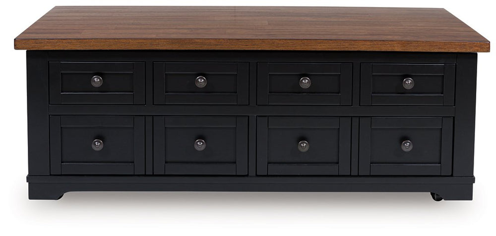 Raise the bar on modern farmhouse style with this lift-top coffee table. Its sturdy silhouette and casual good looks are accentuated with a two-tone finish, which pairs a warm satin black base with a contrasting butcher block veneer top. Combining form and function, its lift top extends for a casual dinner or extra work space in front of your sofa. Two spacious lower drawers and handy storage bins under the top make this piece awfully useful, too. Whether your style is vintage, country or eclectic, this table adds a hearty element.