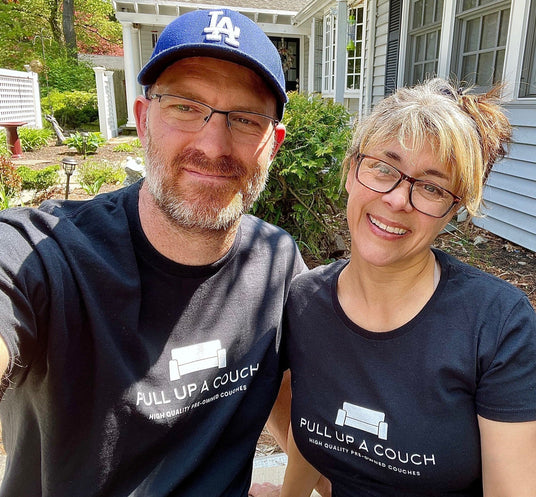My wife, Olga, and I (Jason) started Pull Up a Couch as a side hustle in 2022 from our garage, but after being laid off from my tech job in April 2023, we decided to jump in full time and build the business.